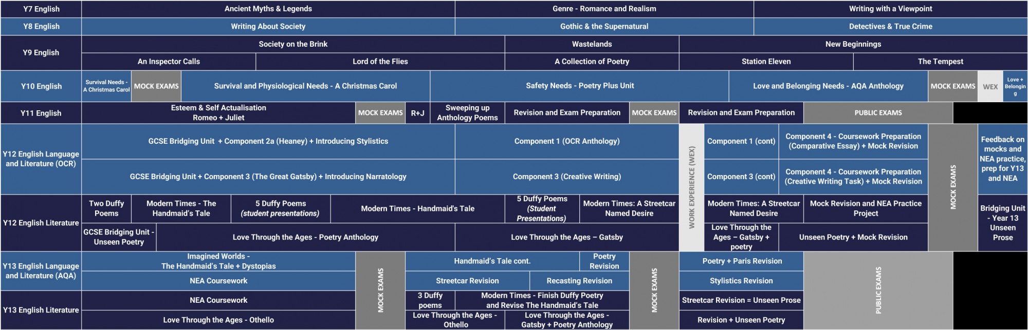| Year 9 | - Plays in context: An Inspector calls - Creative Writing: Extreme Environments - War poetry - Novel study: Girl. Boy. Sea - Shakespeare: The Tempest |